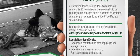 Para participar da seleção para entrevistadores, realizar o cadastro no link: Processo Seletivo – Censo – População em situação de rua SP/2019